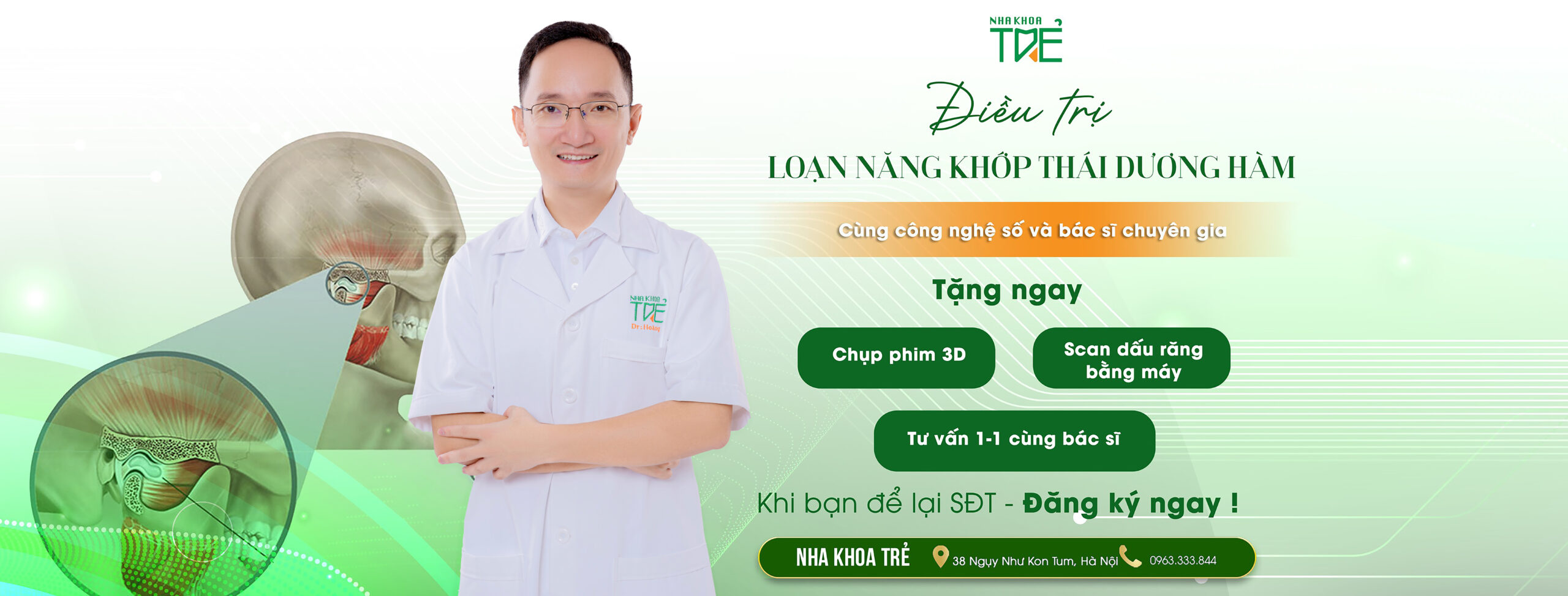 Nha khoa Trẻ là nha khoa hàng đầu tại Hà Nội chuyên sâu điều trị các bệnh lý khớp thái dương hàm: loạn năng khớp thái dương hàm, viêm khớp thái dương hàm,... kể cả những ca phức tạp mà nhiều nơi từ chối.